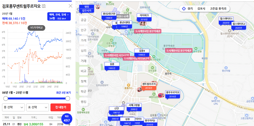 풍무역 맞은편에 위치한 풍무센트럴푸르지오는 최근 7억 내외의 시세로 거래가 이뤄지고 있습니다.